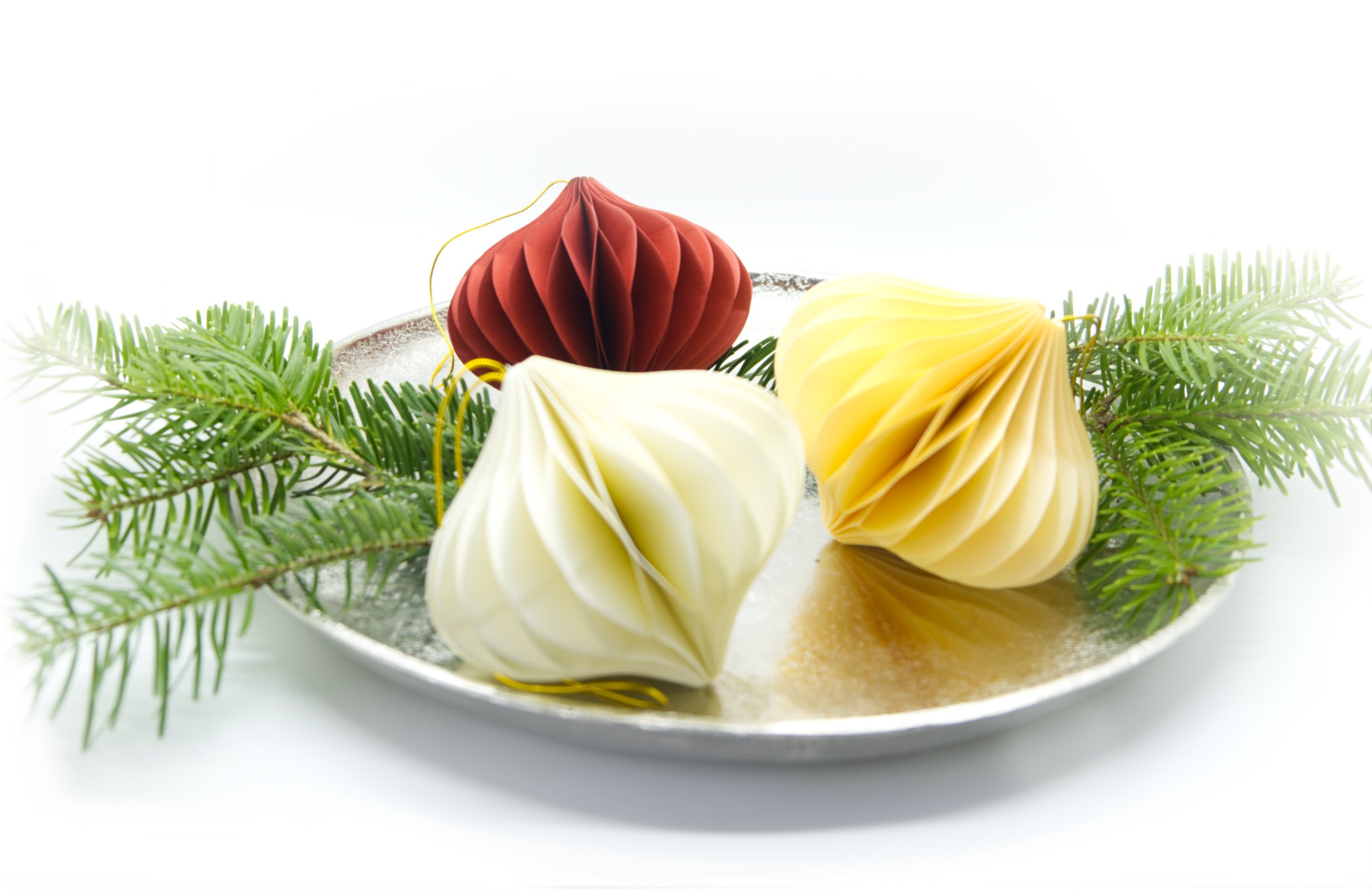 Stilvoll dekorieren gelingt im Handumdrehen mit unserem Weihnachtsanhänger “Kugel” aus formfestem Wabenpapier. Die edle Form macht sowohl am Weihnachtsbaum als auch im Raum oder in einer Schale eine gute Figur.